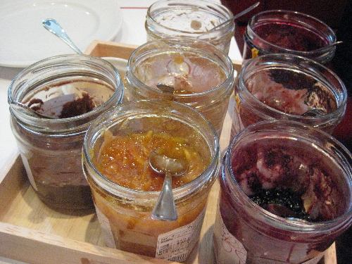 マーマレード、いちご、ブルーベリー、アプリコット、チョコペースト、はちみつ・・・あとは何だったかなー(汗)